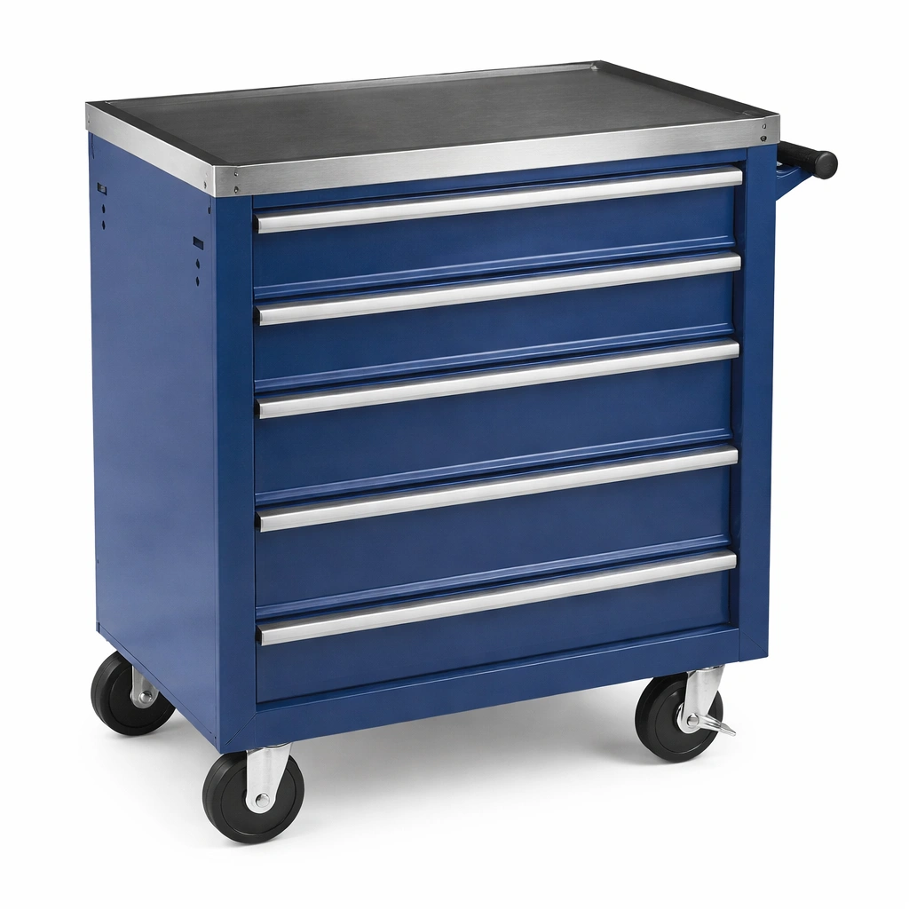 Carro de herramientas fabricado en acero al carbono resistente con 5 cajones espaciosos y guías deslizantes. Dimensiones: 68 cm de largo x 45 cm de ancho x 85 cm de alto. Cada cajón tiene una capacidad de carga aproximada de 25 kg. Equipado con ruedas de caucho para movilidad y sistema de bloqueo para estabilidad.